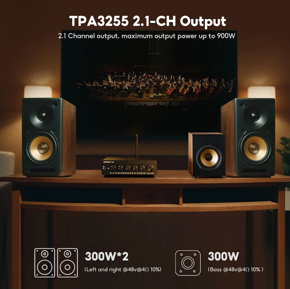 Output Power: Left/Right 300w*2@48v@4Ω 10%, Bass 300w@48v@4Ω 10%