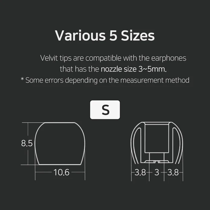 Divinus Velvet eartips are available in 5 different sizes. Starting with the S size we have MS, M, ML, and L sizes. These have a nozzle diameter of 3 to 5mm for the in-ear monitor side. Each set comes as a set of three pairs of eartips.