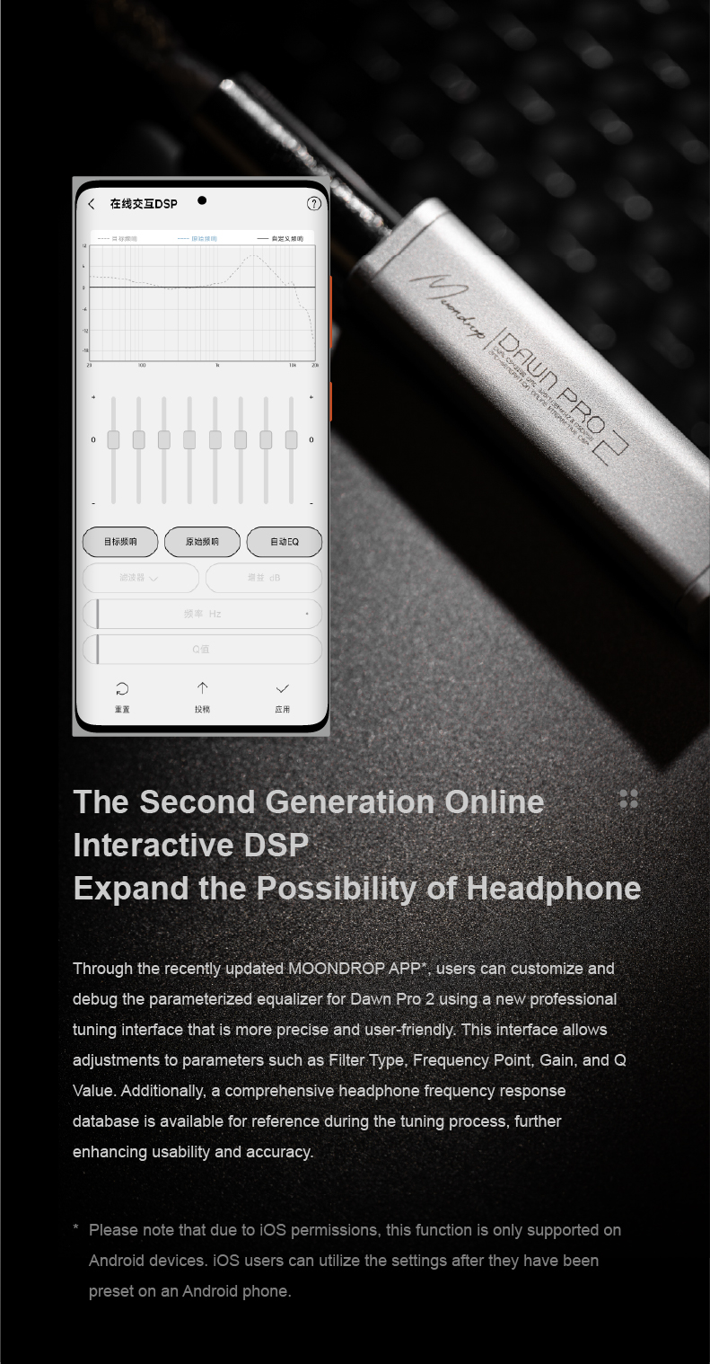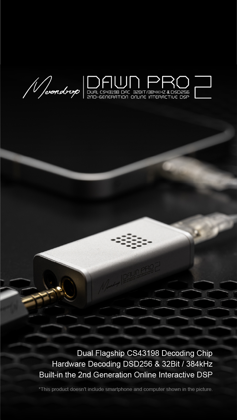 Introducing the Moondrop Dawn Pro 2, a successor to the highly acclaimed Moondrop Dawn Pro portable USB DAC/AMP. Moondrop has designed the new Dawn Pro 2 with a dual CS43198 DAC chipset along with a high-thrust amp section that delivers a strong output, easily driving different IEMs and Headphones. It features a second-generation Online Interactive DSP function that enables unlimited tuning possibilities with a graphical PEQ that allows for easy parameter adjustment, such as filter type, frequency point, gain, and Q factor. Moondrop has also designed a web-based interface for adjusting different parameters on a PC or a Laptop. Moondorp Dawn Pro 2 packs powerful performance in a compact and handy chassis. It has 100-level independent volume adjustment as well for easy pairing with demanding as well as high-sensitivity IEMs. Upgrade your portable setup with the Moondrop Dawn Pro 2, a highly-equipped portable USB DAC/AMP designed for audio lovers worldwide!!