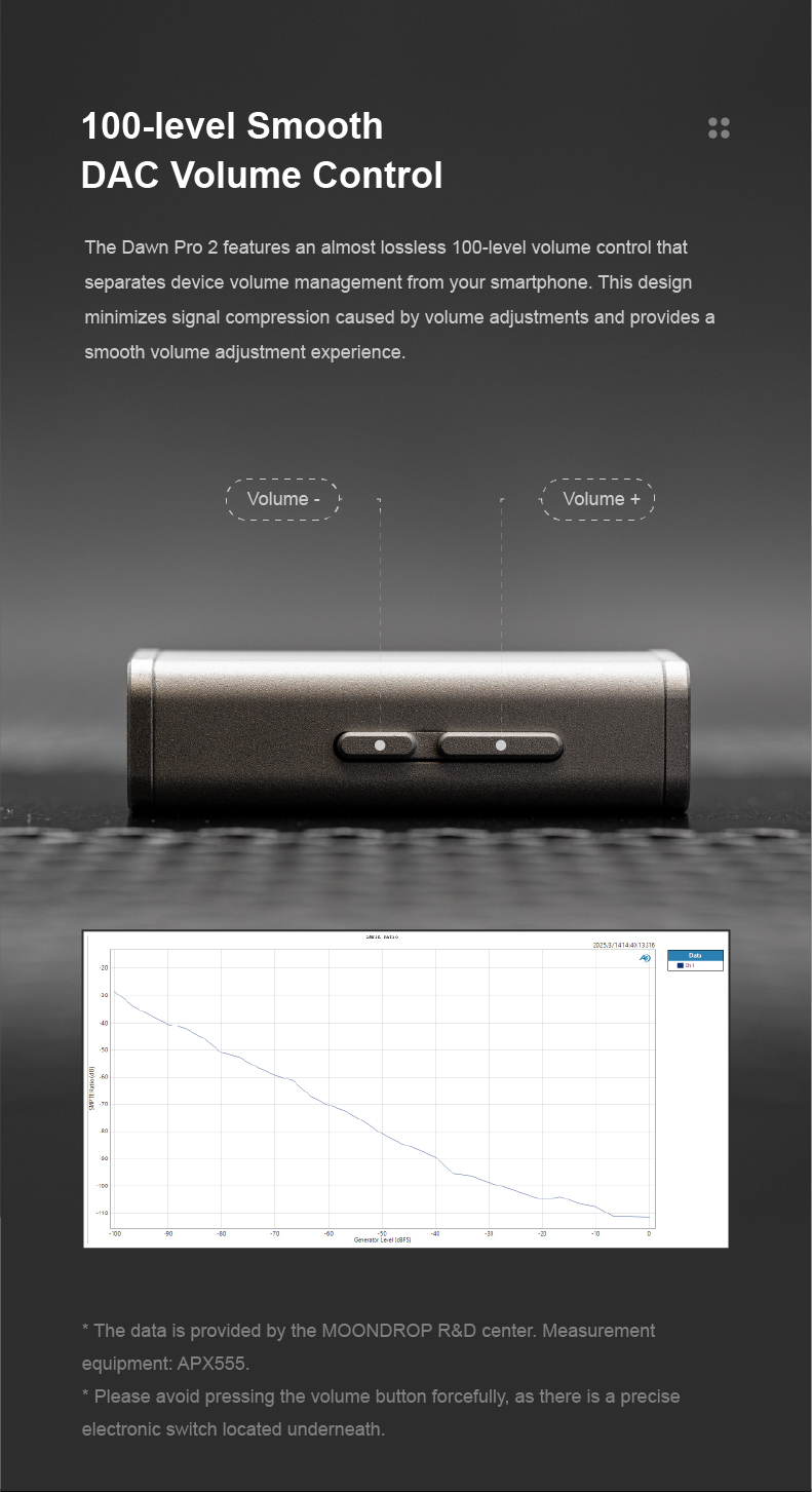 Moondrop Dawn Pro 2 features a 100-level adjustable volume control that enables precise volume adjustment. This independent volume adjustment makes it easy to pair high-sensitivity IEMs with the device. With independent volume adjustment, Dawn Pro 2 minimizes signal compression caused by volume adjustments and provides a smooth volume control.