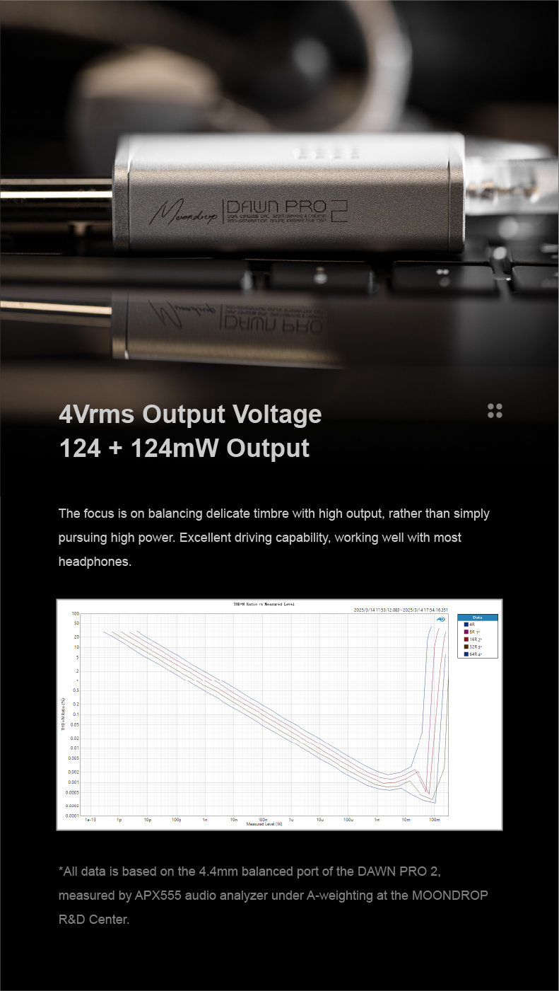 Moondrop Dawn Pro 2 packs in top-quality hardware that provides exceptional high-resolution audio signal processing. At the core, we have a dual DAC setup featuring dual CS43198 flagship 32-bit DAC chips from Cirrus Logic.  The main audio circuitry utilizes three LDOs to provide separate power to the decoding and digital chips. With this advanced dual-DAC setup, the Dawn Pro 2 delivers crisp high-resolution audio signal processing with high DNR, SNR, and ultra-low THD+N performance. You will enjoy your favorite music in new-level clarity with the Moondrop Dawn Pro 2!!