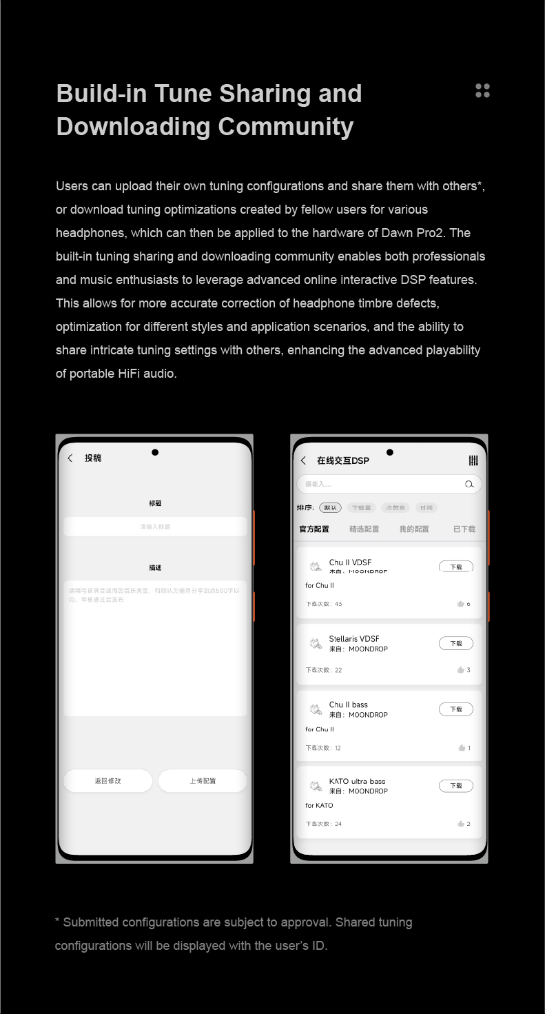 Moondrop Dawn Pro 2 is fully compatible with the Moondrop Link application available on Smartphones. It allows users to access different settings on the Dawn Pro 2. It also supports advanced DSP functions such as a dedicated parametric equalizer. The application also has an online community function where users can share/download their own tuning settings. Moondrop is continuously uploading different target responses on the application. PC/Laptop users can access the same set of features and settings through Moondrop’s web-based application. Both the Moondrop WEB and Android application updates occur simultaneously.